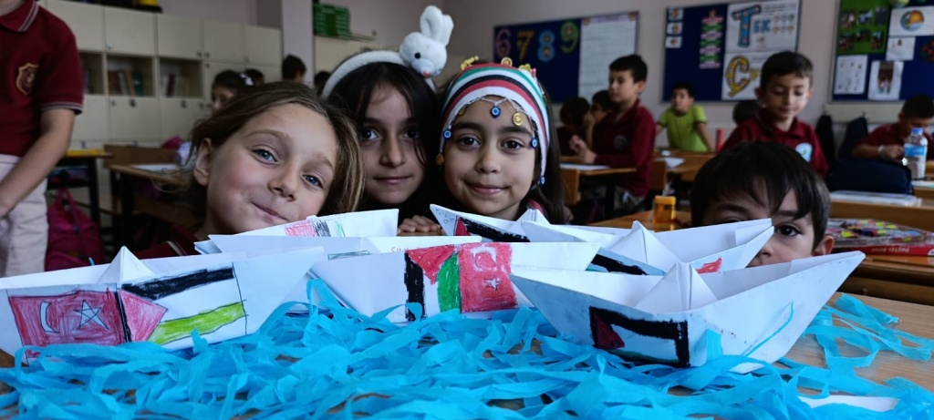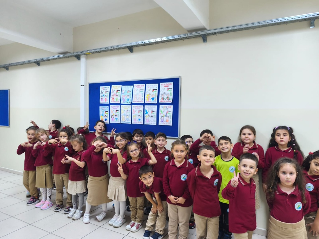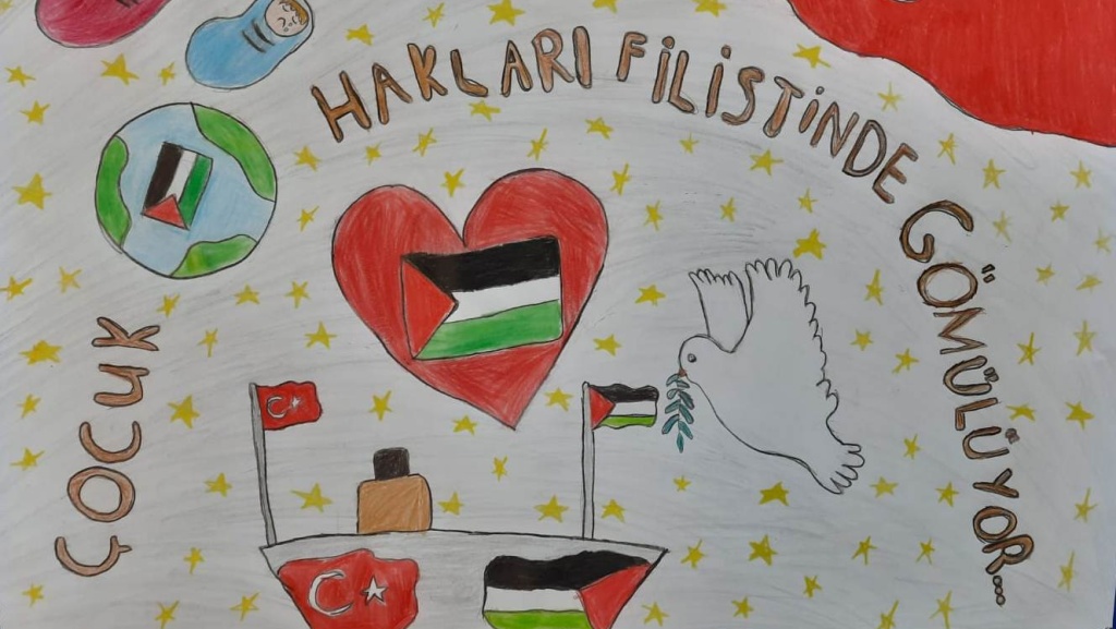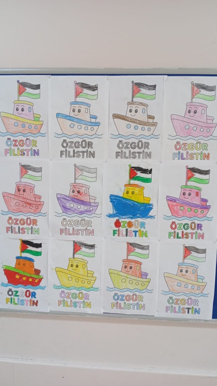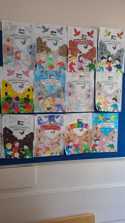 Okulumuzda, Filistin'de yaşanan insanlık dramına dikkat çekmek ve öğrencilerde farkındalık oluşturmak amacıyla çeşitli etkinlikler gerçekleştirildi. Etkinlikler kapsamında öğrenciler, Filistin halkına destek mesajlarını içeren afiş, pankart ve resimler hazırladı. Barış, kardeşlik ve dayanışma temaları ön plana çıkarıldı. Öğretmenler rehberliğinde gerçekleştirilen bilgilendirme çalışmalarında, Filistin'de yaşanan olayların tarihsel arka planı ve çocukların yaşadığı zorluklar öğrencilerle paylaşıldı.